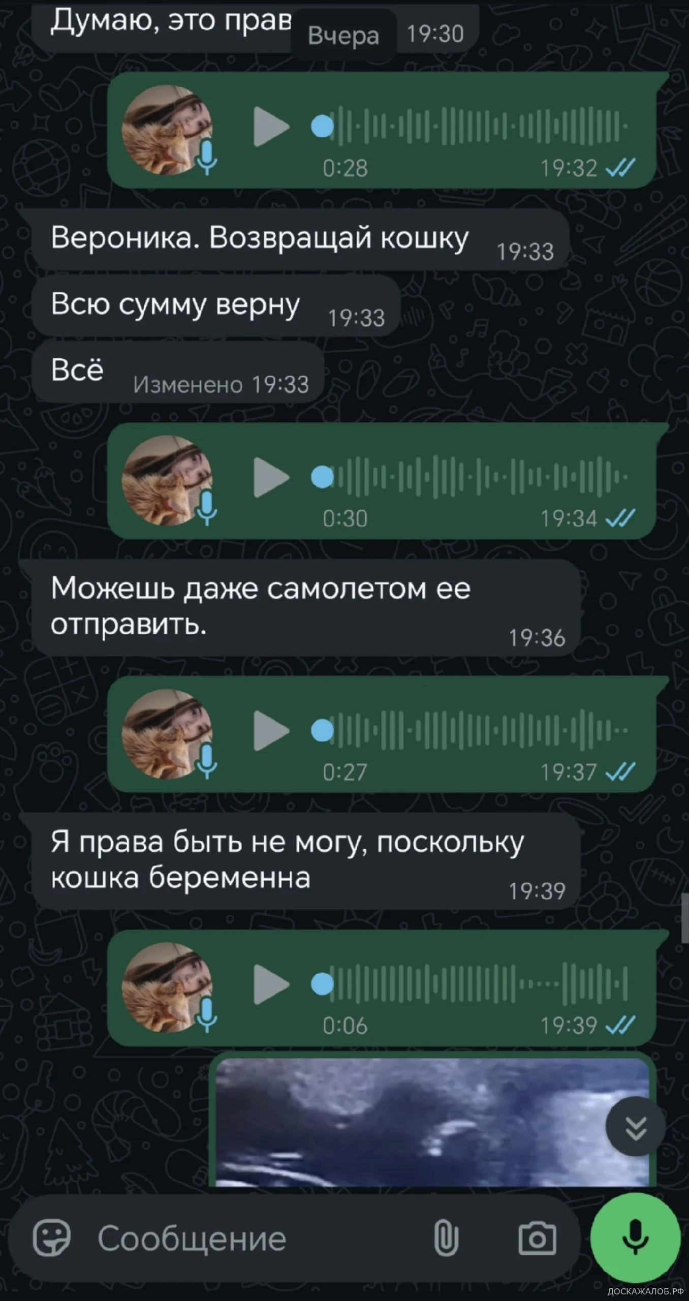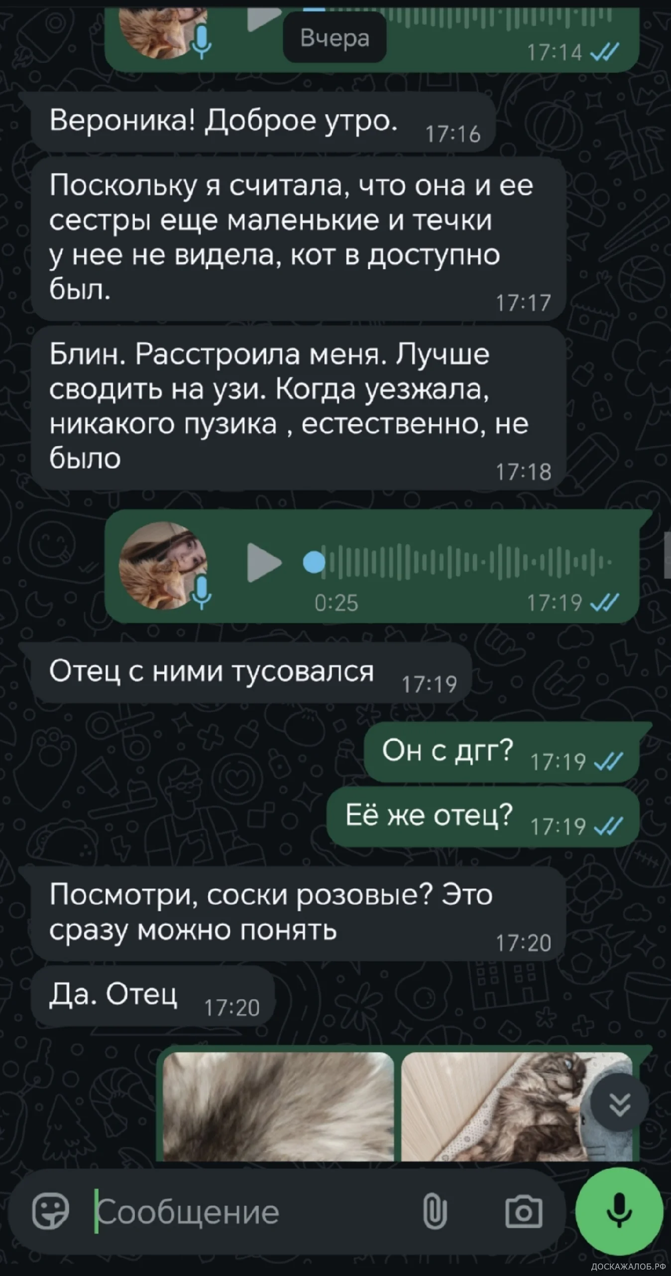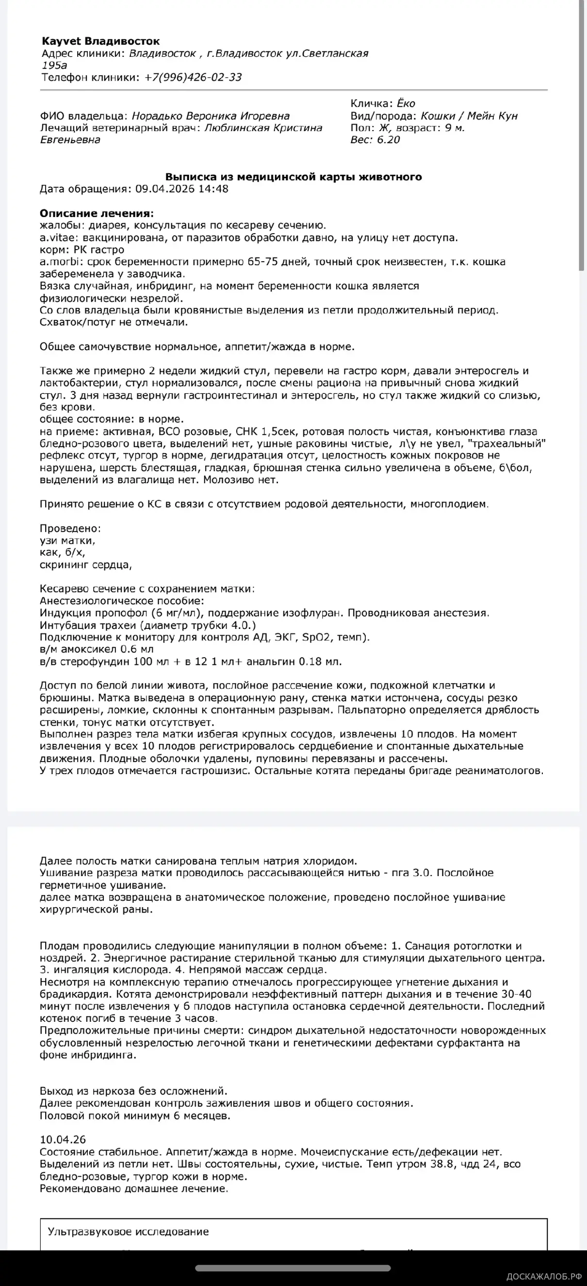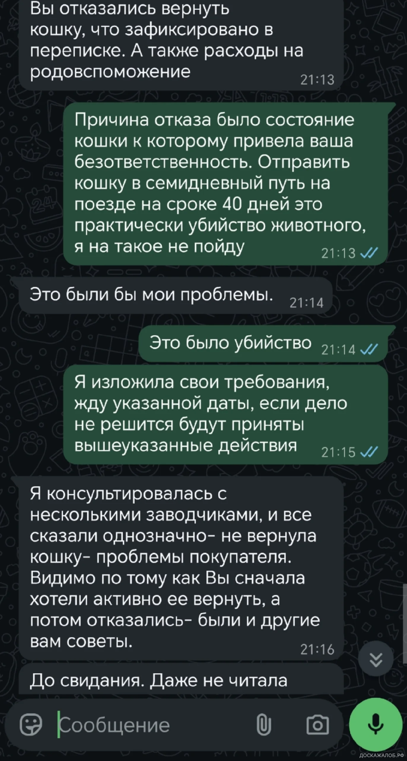 Купила данную кошечку в разведение, когда она приехала выяснился факт беременности (около 40 дней). Была беременна от отца и с несовместимыми генами (дгг на дгг) что подтверждается в переписке. Заводчица отказалась возвращать часть денег за кошку и сказала ждать результатов родов, мол если котята выживут - это бонус. Кошка сама разродиться не смогла делали кесарево. Итог - 10 котят погибли, операция была сложная, период восстановления у кошки год - полтора. Списались с заводчицей и она отказывается возвращать деньги или даже мед. расходы, говорит что предлагала возврат денег за возврат кошки сразу, да, предлагала, но кошка на 40м дне беременности просто не пережила бы 7 дней в поезде обратно. Она уже получила кучу стресса от 7ми дневного пути на поезде до меня, адаптации в новом доме и к новому окружению, поэтому возврат на котором настаивала заводчица был бы для кошки скорее всего смертельным, я на это не пошла по этой причине. Отправить кошку самолётом не было возможности так как выяснилось что у неё нет прививки от бешенства в 8ми месячном возрасте.