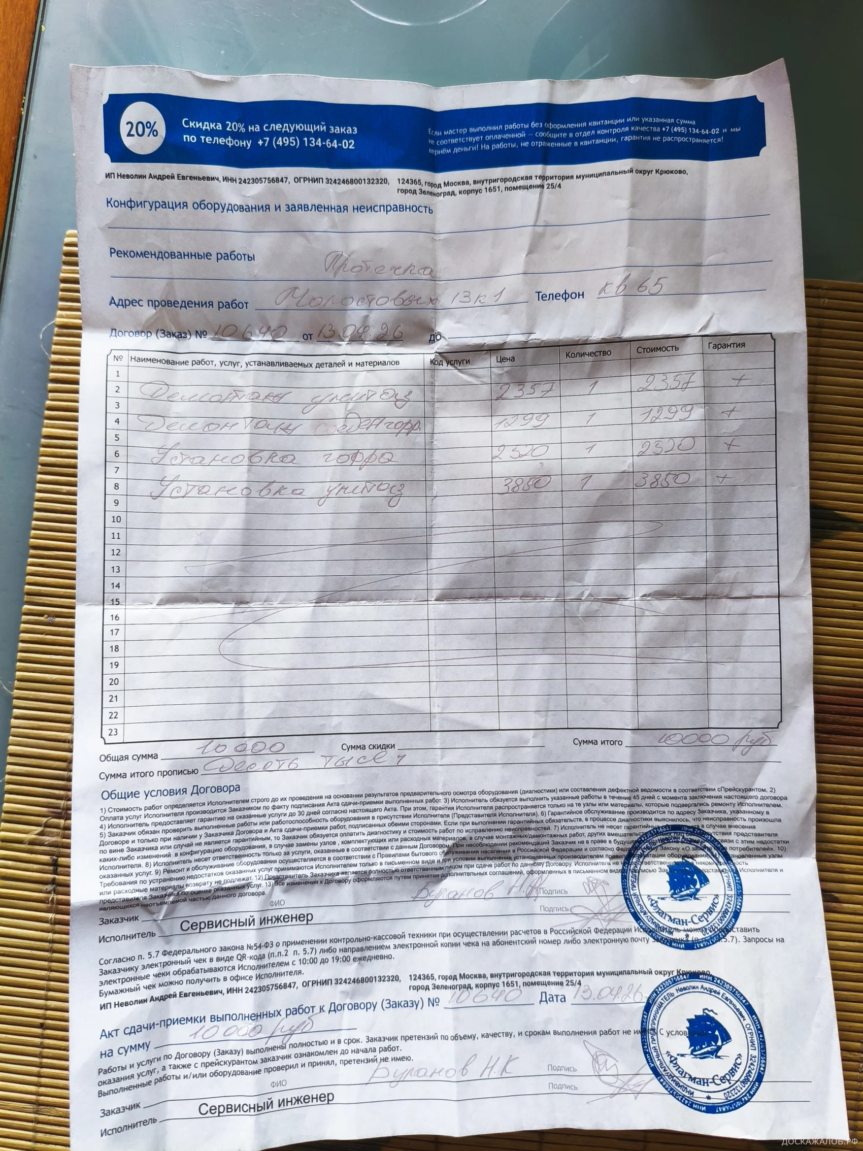 Пришёл сантехник, в Москве,13.04.2026,сказал нужно гофру менять это будет от 3 тысяч, до начала работ не ознакомил меня с ценами за услуги и какие виды работ будут проводится, я пошёл за гофрой, купил за свои средства, возвращаюсь, мастер ставит гофру, без герметика, просто поменял, ставит унитаз обратно,10 тысяч рублей, и это я тебе по минималке сделал, почему до начала работ он не показал мне цены, что снять и поставить унитаз обратно это,6 тысяч рублей, новый с установкой стоит 5-7тыс.,в итоге после мастера мой унитаз стал шататься, жду мастера доделать по гарантии, уже 11 день, считаю что переплатил раза в 3 и работы выполнены не качественно